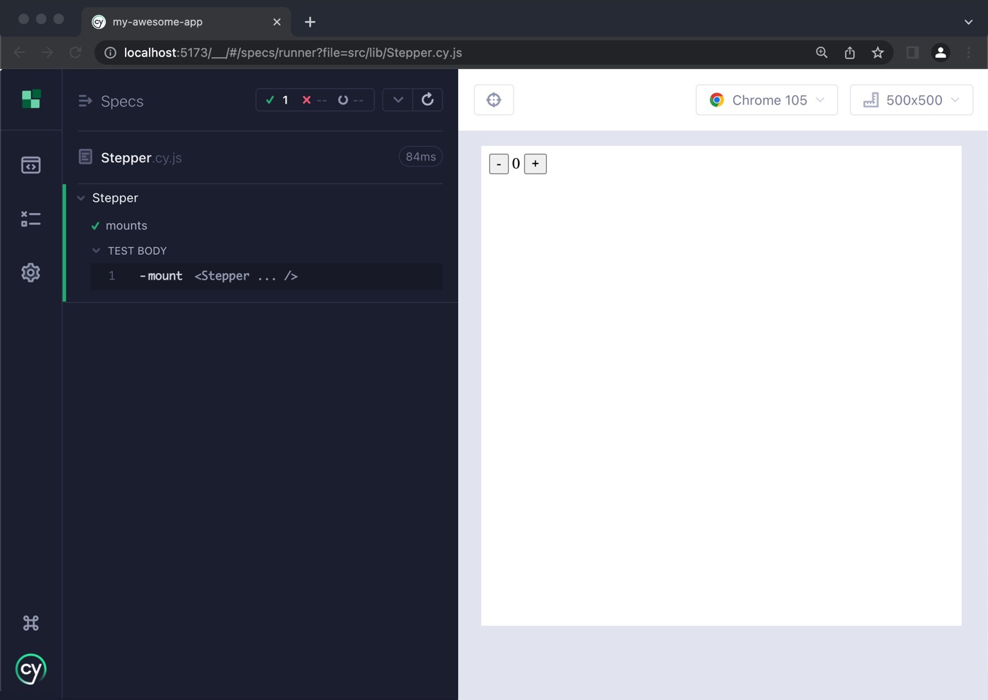 Switch back to the browser you opened for testing, and you should now see the Stepper.cy.js file in the spec list. Click it to see the spec execute.